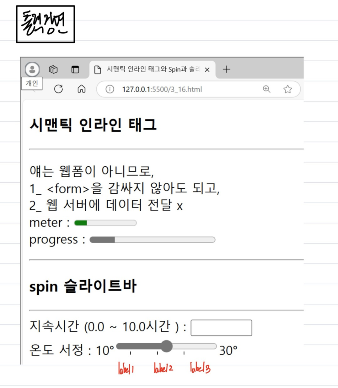 [ 연습_<input>기능5 : 시맨틱 인라인 태그 <meter><progress> vs 웹폼 스핀 , 슬레이트 바 ] :