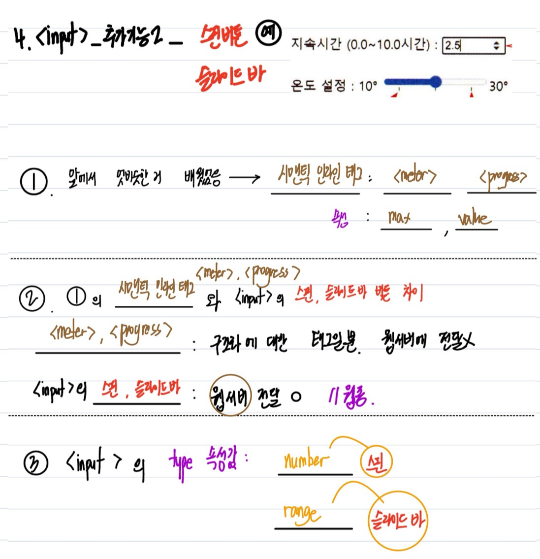 - <시멘틱 인라인 태그>의 <meter> , <progress> 태그 vs 웹 폼 태그 <input type = " number | range ">의 차이