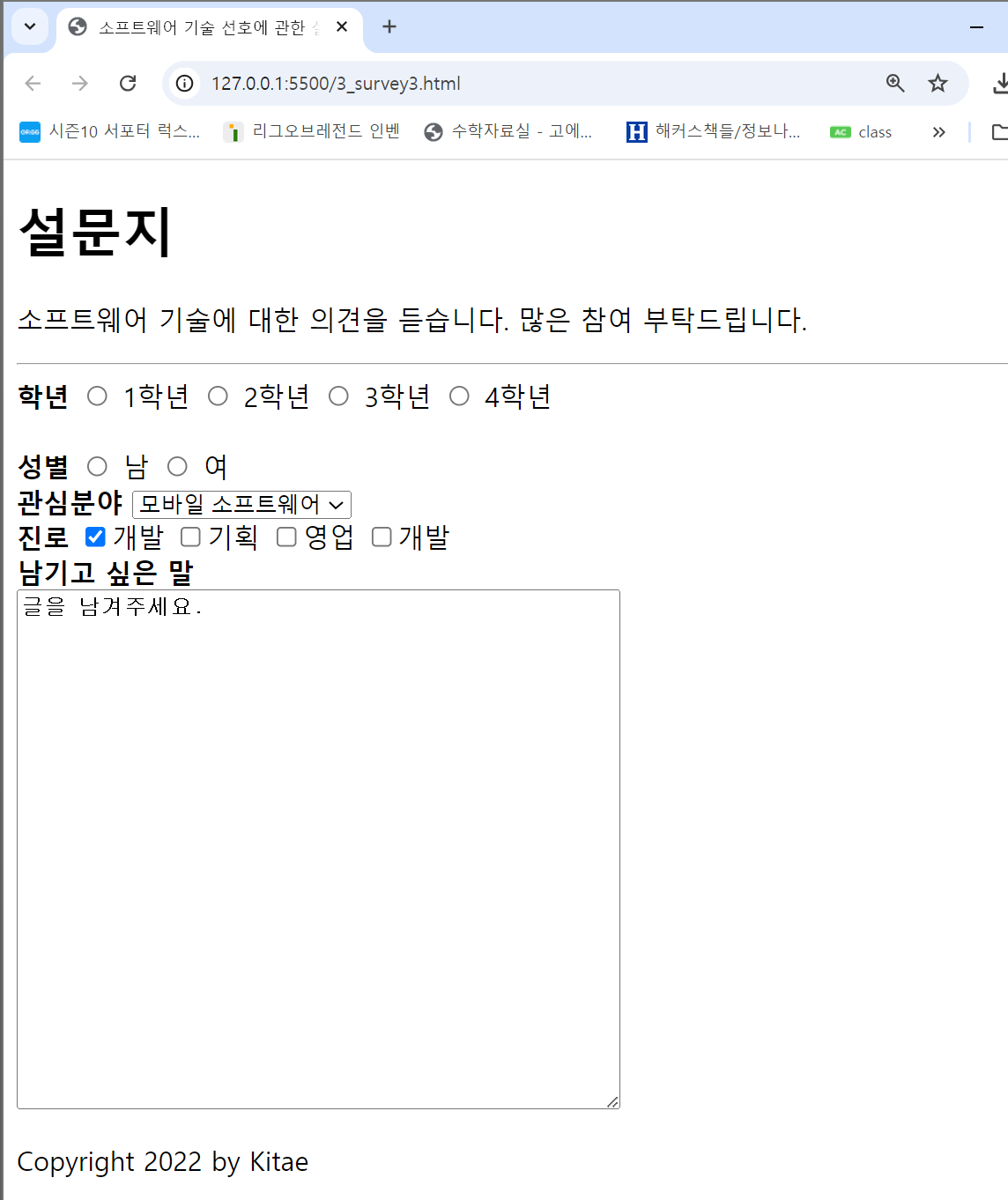 - 학년 | 성별 | 관심분야 | 진로 | 남기고 싶은말 5개 항목의 설문조사가 있으므로, => 5개<form>으로 감싸야 하나? 아니면 <form> 딱 하나로 전부 감싸는 걸까?