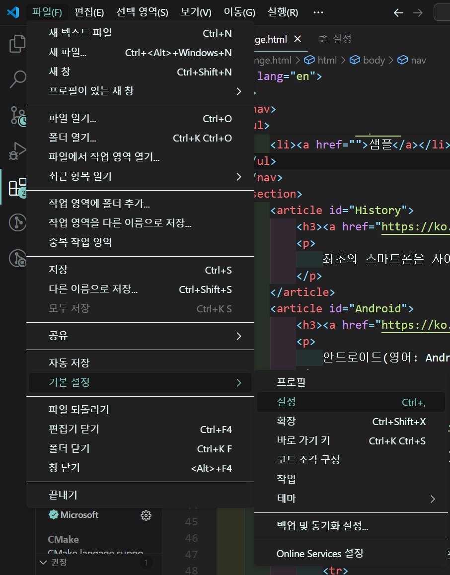 1_ 맨 위 탭의 [ 파일 ] => [ 기본 설정 ] => [ 설정 ]