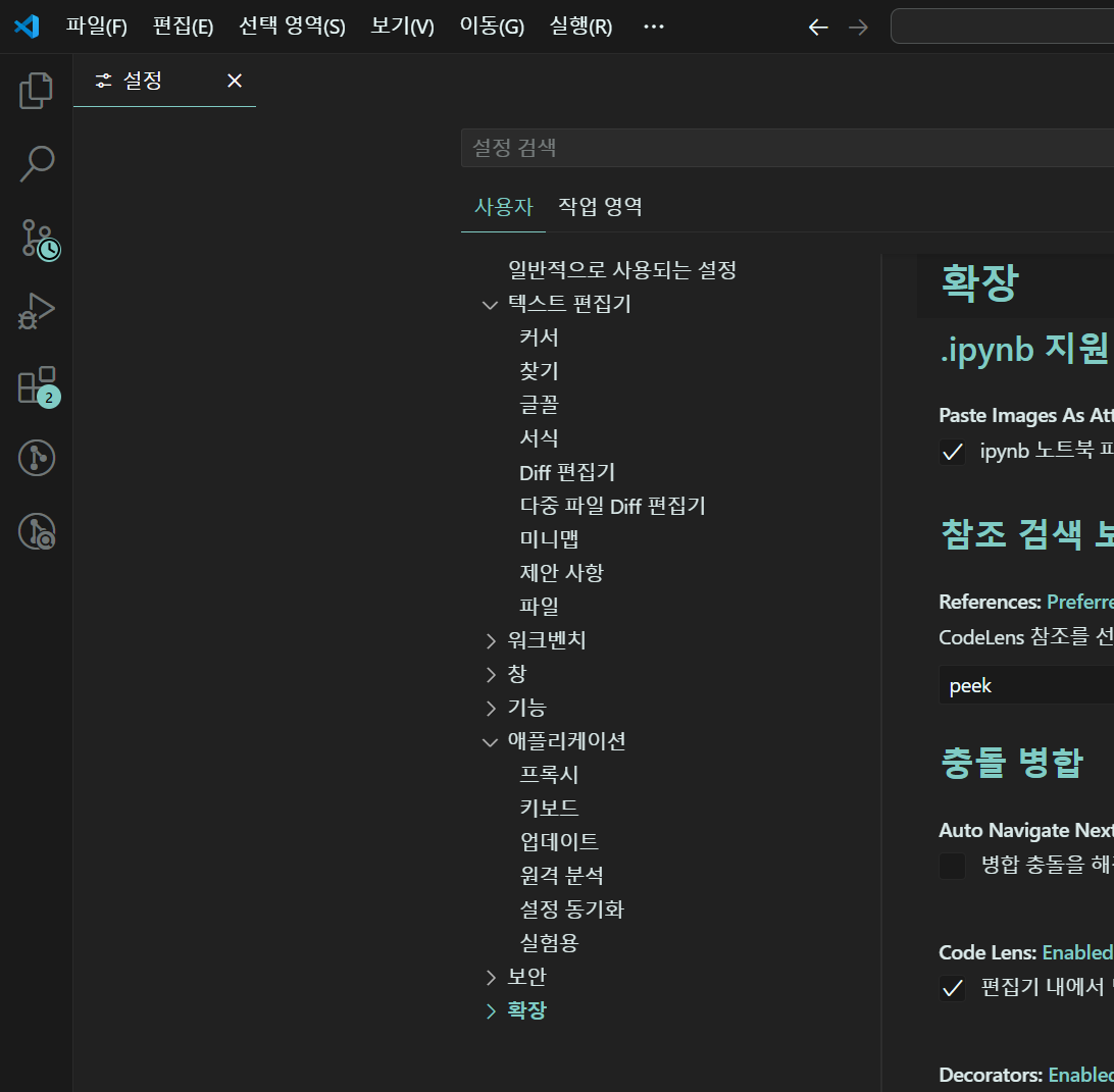 2_ 설정창 맨위 [ 사용자 ] => 그 메뉴 중 맨아래 [ 확장 ]
