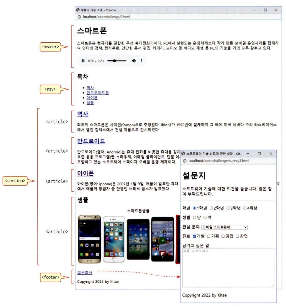 <footer>부분에 설문조사 링크를 하나 더 추가하여, 새로운 윈도우창에 사진과 같이 출력되도록 설문조사 페이지를 html문서를 작성하시오.