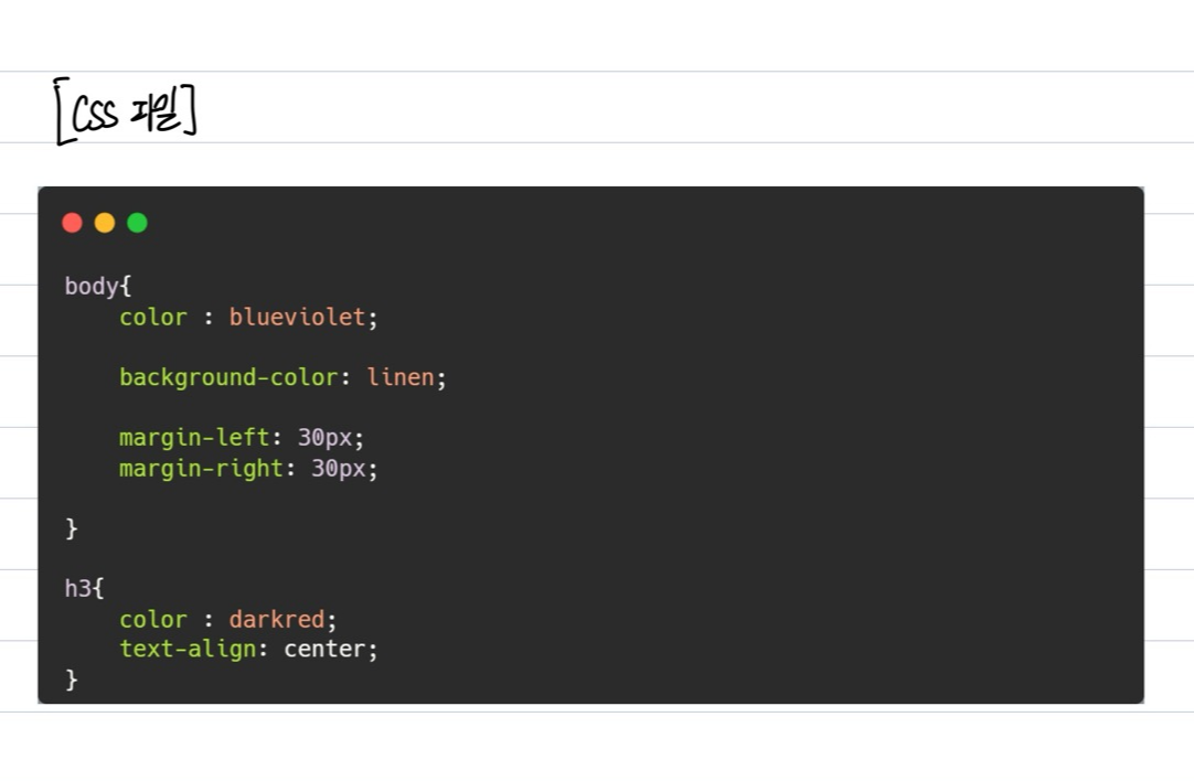 셀렉터 : { 프로포터 : 속성값 ; ...... ; 프로포터 : 속성값 ;(생략가능) }