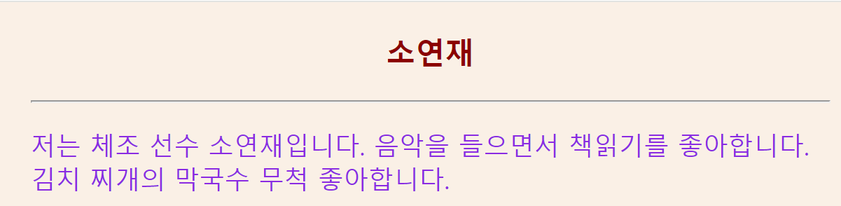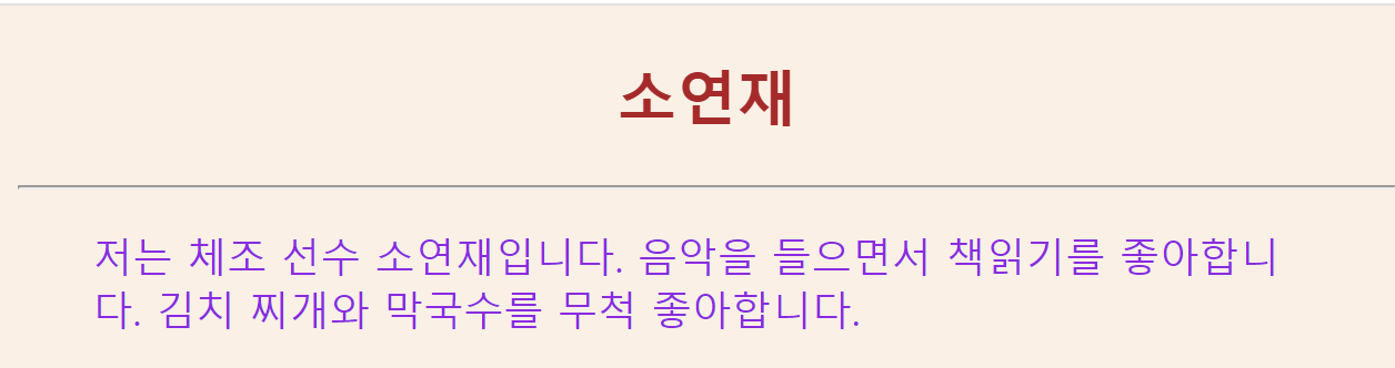 저는 체조 선수 소연재입니다. 음악을 들으면서 책읽기를 좋아합니다. 김치 찌개와 막국수를 무척 좋아합니다.