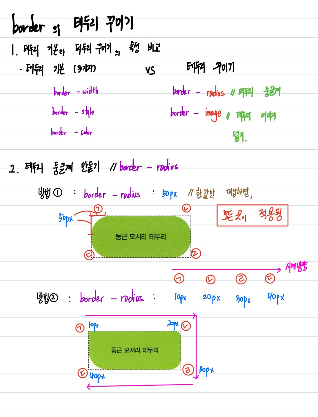- 방법2_ border - radius : 10px 20px 30px 40px ( left-top부터 시계방향으로 10px 20px 30px 40px )
