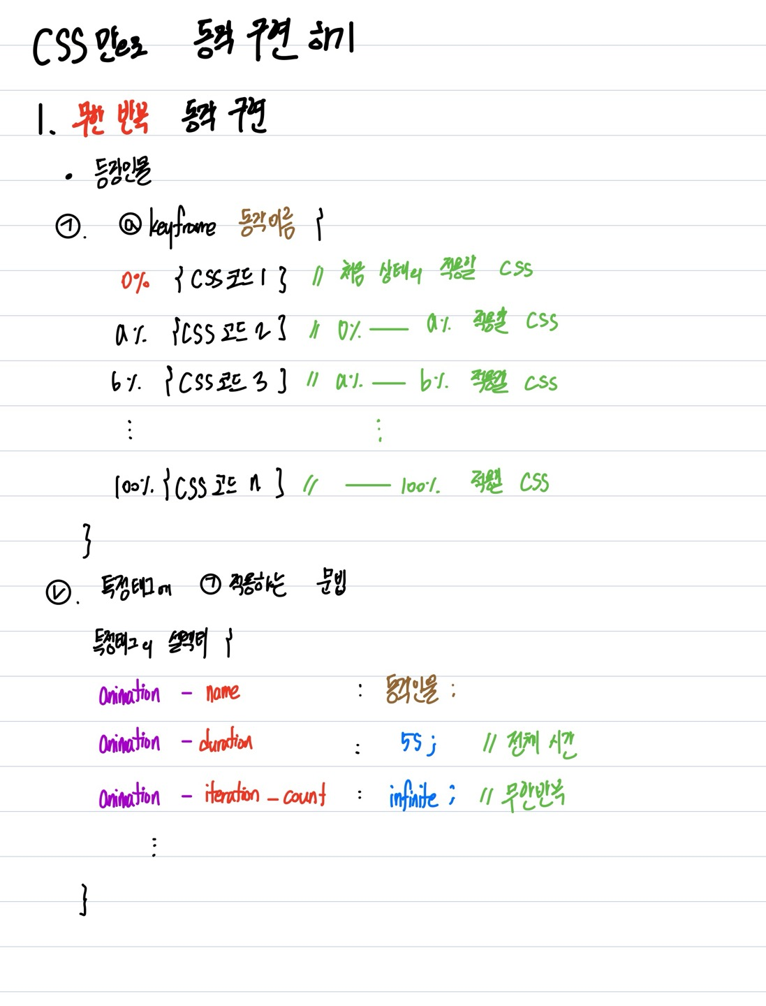 - CSS만으로만 무한 반복 애니메이션 동작 구현 => @keyframe 동작이름 + animation - name / duration / iteration - count