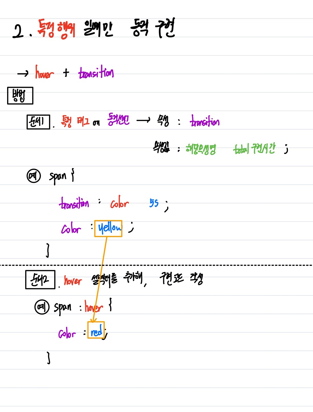 - CSS만으로만 행위할 때만 작동하는 애니메이션 동작 구현 => transition : 변화할 속성명 동작 시간 + hover