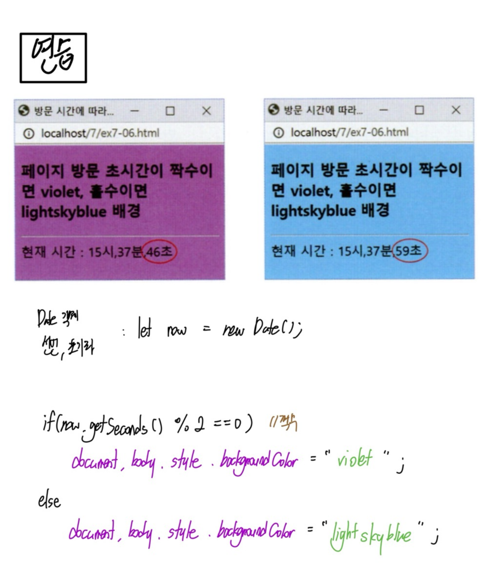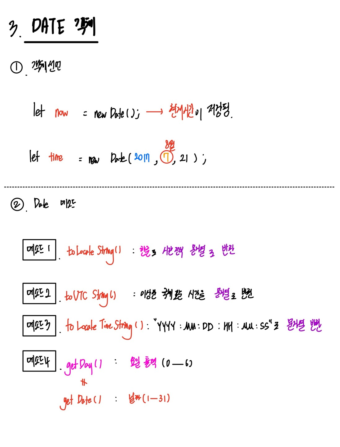- 메소드 종류 : toUTCStirng() , toLocaleString(), toLocaleTimeString(), getDay()//요일 반환 vs getDate()//몇일 반환