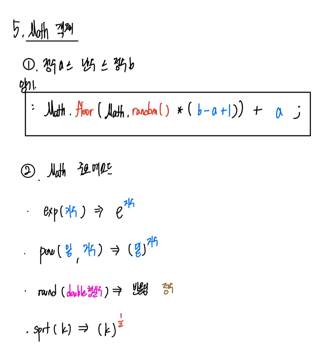 - 메소드 종류 : exp(지수) , pow(밑, 지수) , round(실수) , sqrt(밑)