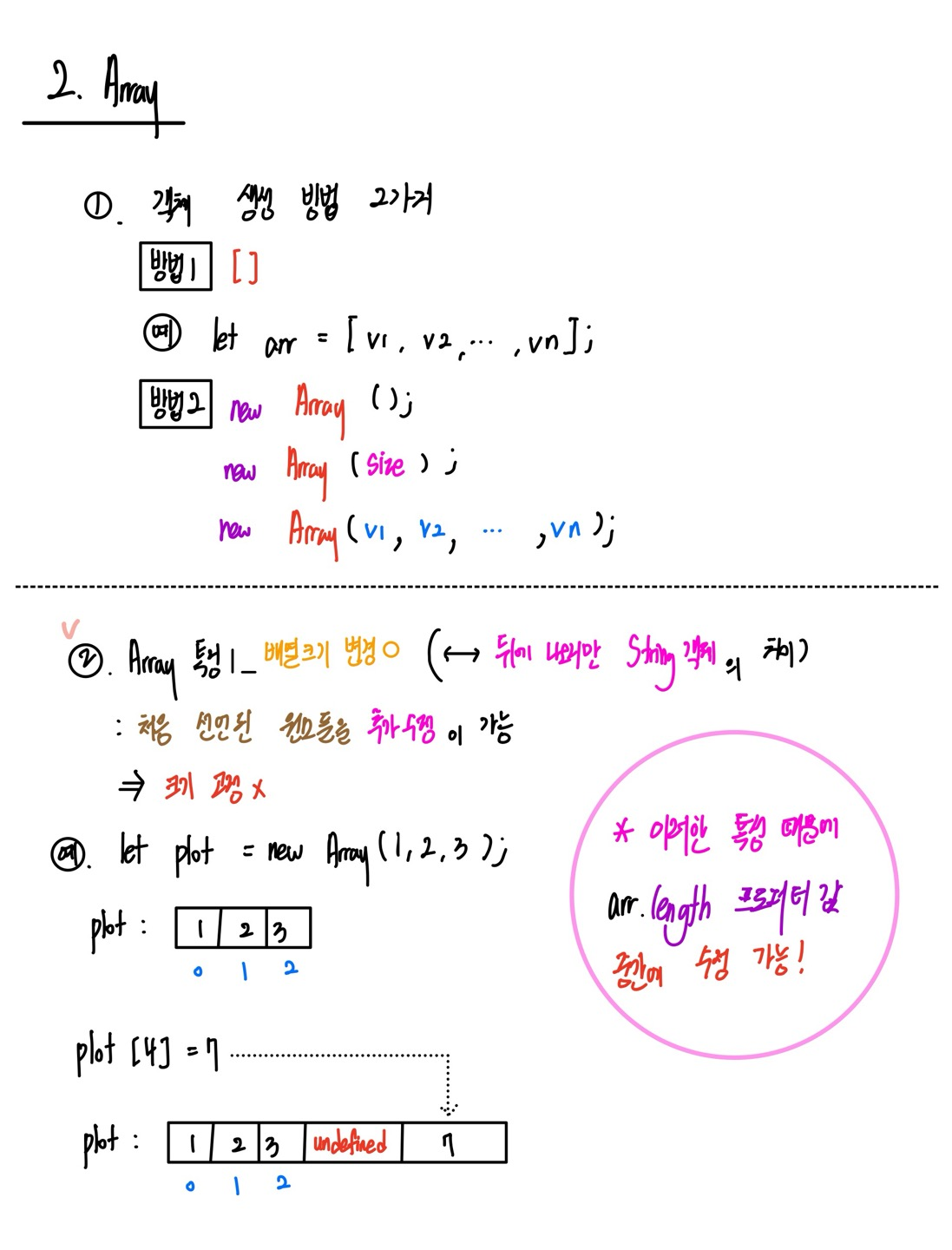 - 크기가 고정이 아니다. => lengh 속성값 중간에 변경 X , 크기보다 뒤에 값 저장시 , 그 사이 속성값은 undefined 가 된다.