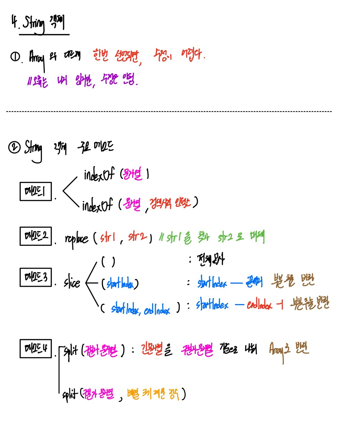 - 메소드 종류 : concat // Array 합치기 메소드 , join //원소마다 구분자 문자열 붙여 문자열 반환 , slice //부분 추출 반환 메소드 , toString //==join()