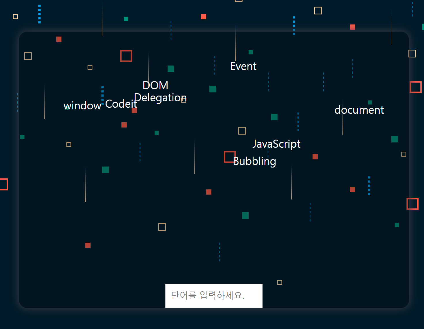 이번 실습에서는 단어가 떨어지는 건 아니지만, 그동안 배운 것들을 활용해서 input 태그에 단어 입력이 완료되면 화면에 있는 단어들이 사라지도록 만들어 봅시다.