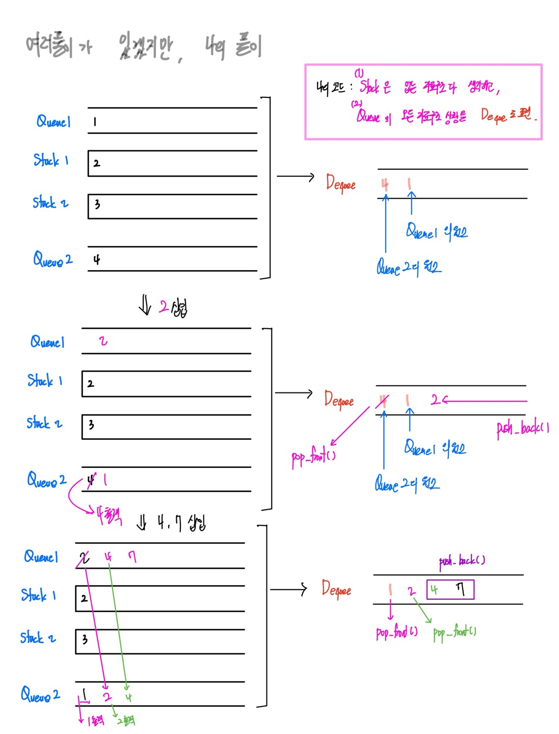 - Queue의 자료구조는 역순으로 , Deque 1개로 Queue들의 모든 상황으로 표현한다.