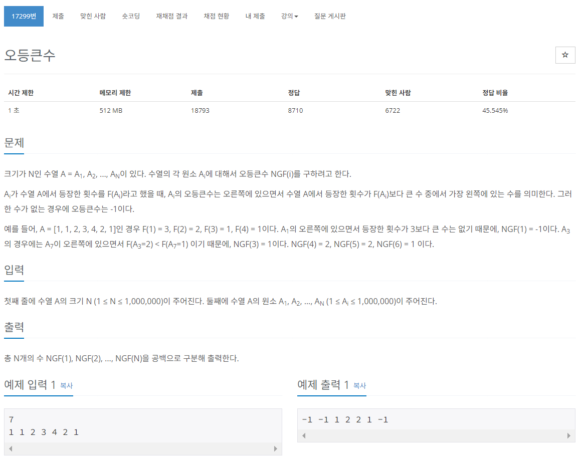 1_ 백준 17298번 문제인, "오큰수" 문제부터 이해하고 오기 [ https://www.acmicpc.net/problem/17298 ]