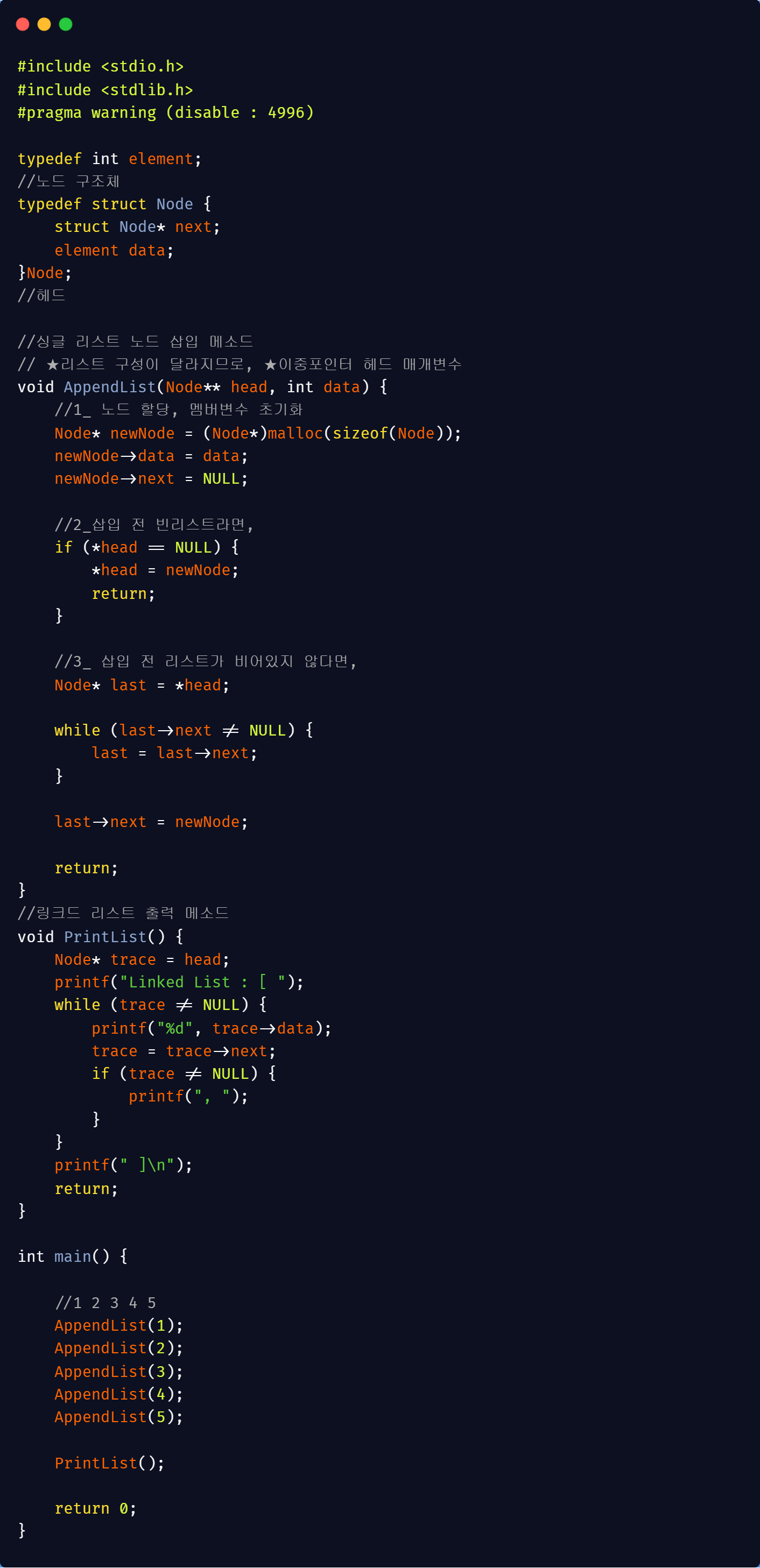 ##연결리스트 구조체,삽입,출력 코드 :