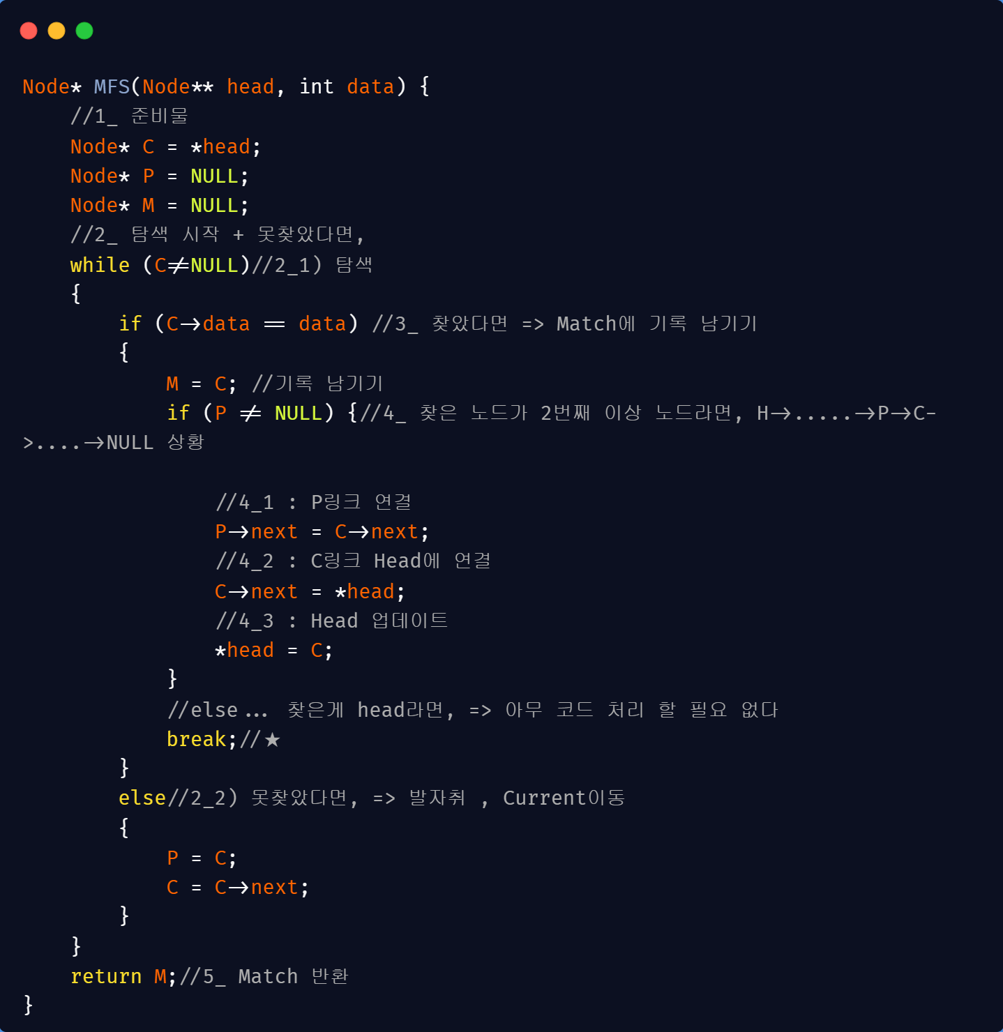 if (P != NULL) {//4_ 찾은 노드가 2번째 이상 노드라면, H->.....->P->C->....->NULL 상황