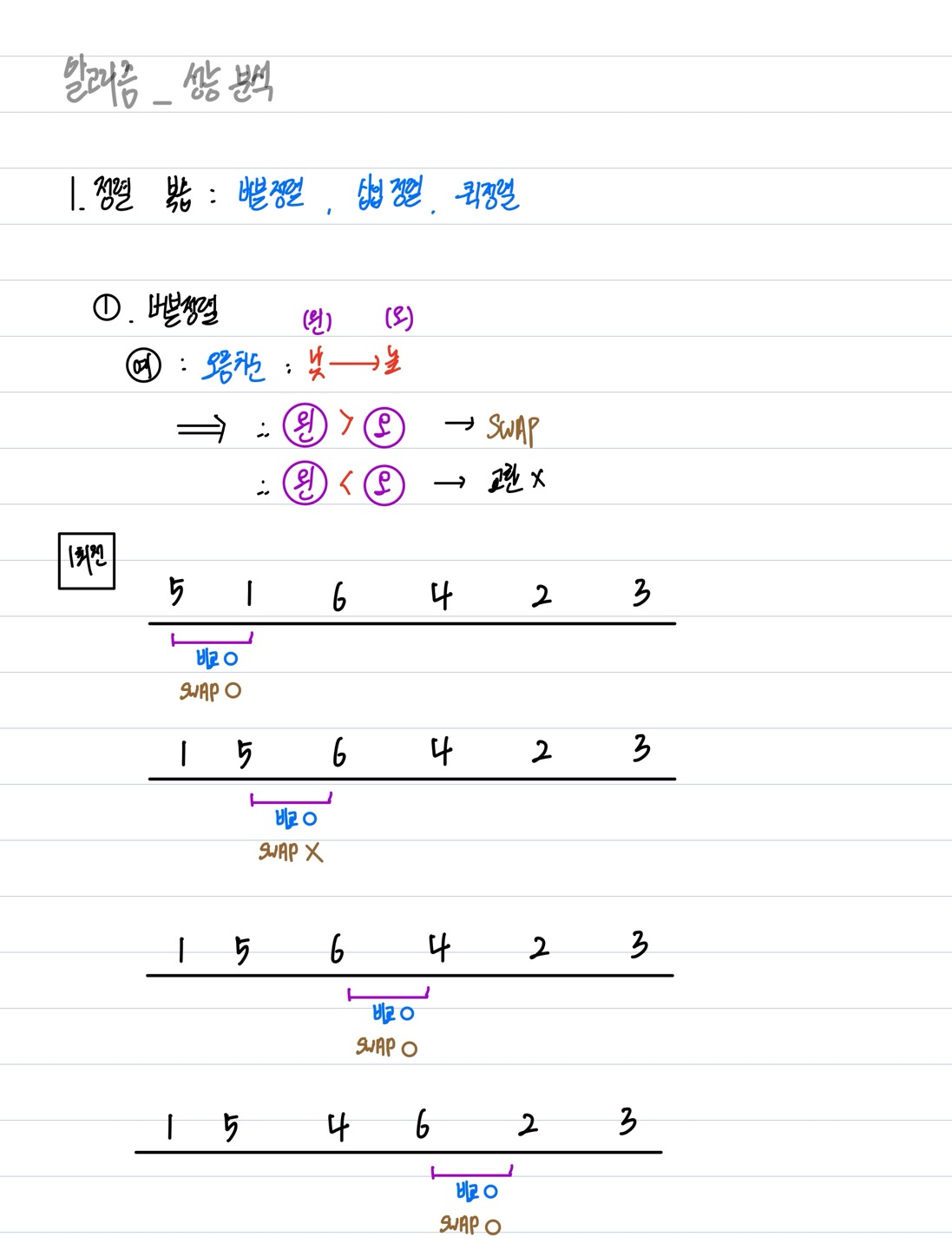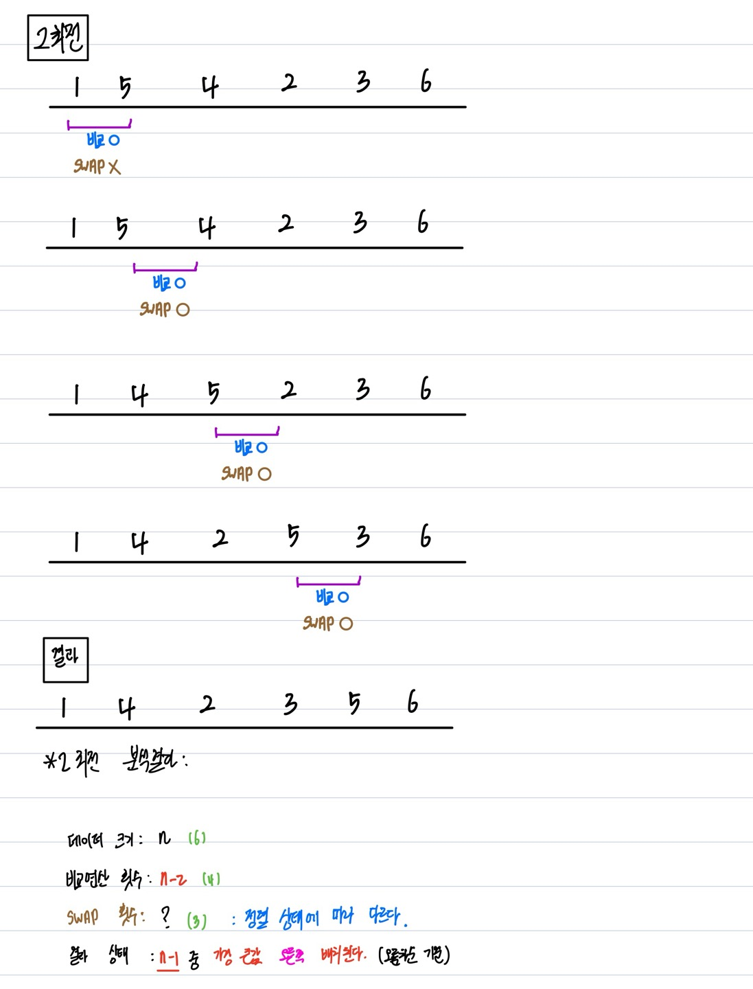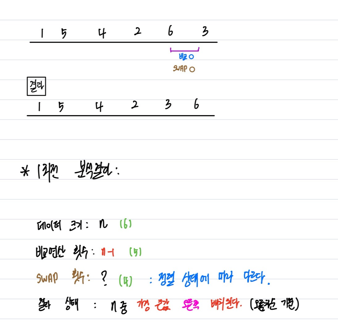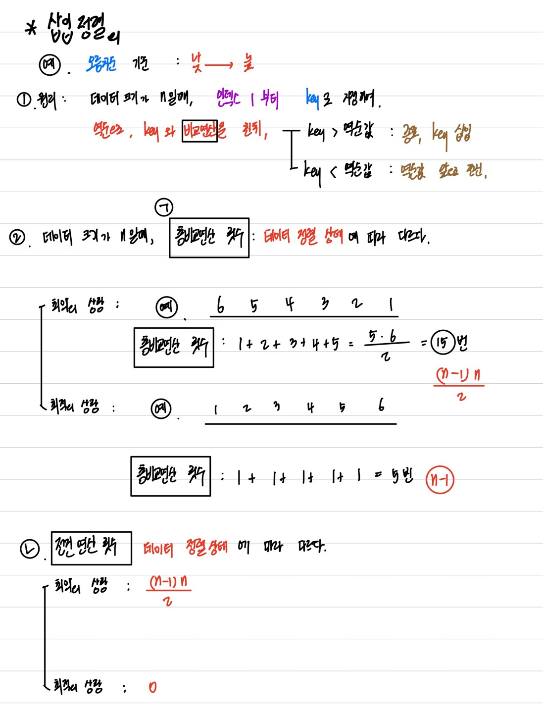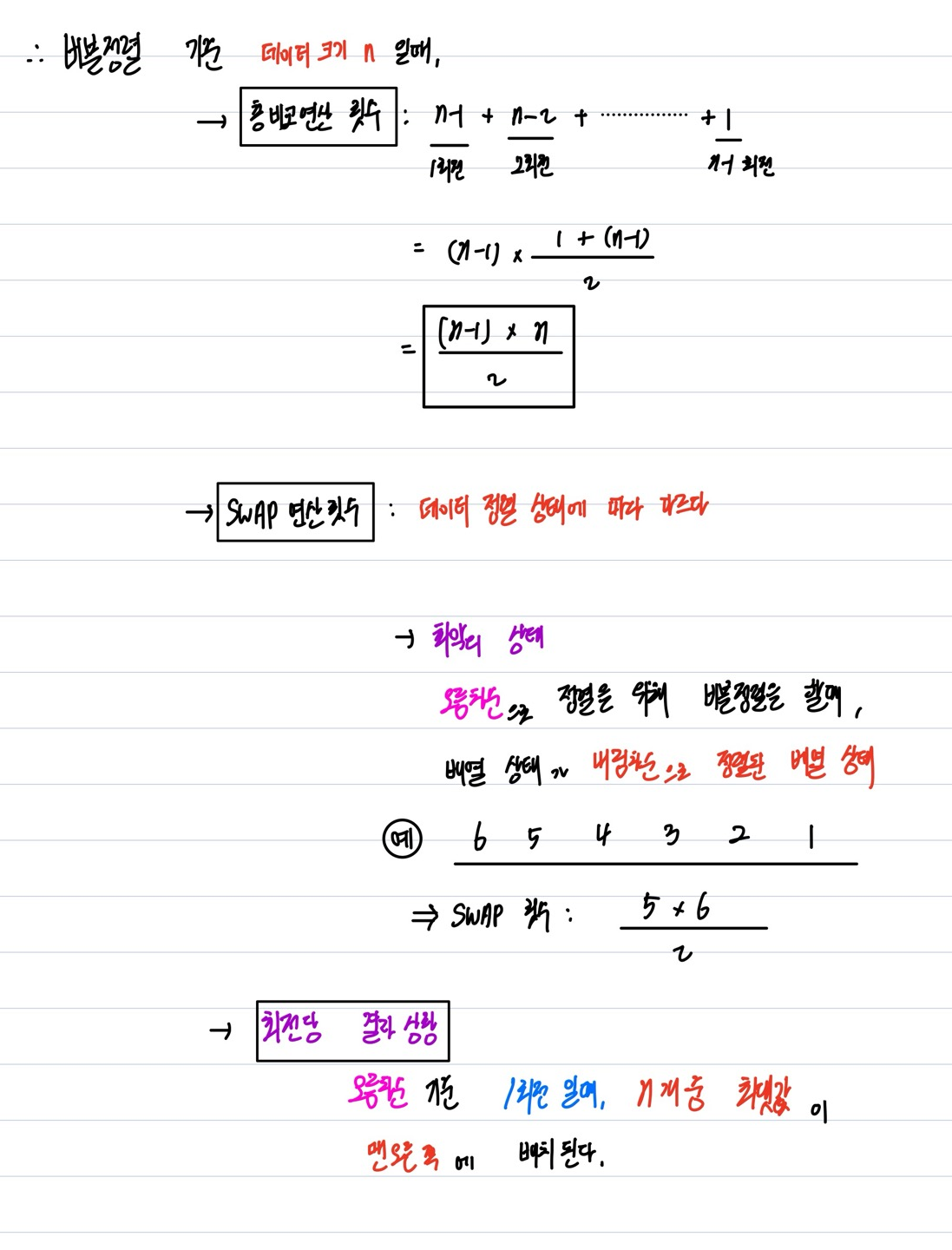 - 총 비교 연산 횟수 : 1부터 N-1합 == (N-1)*(N)/2 (정렬상태에 따라 다르다!!)