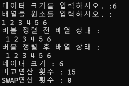 최적의 정렬 상태 : 오름차순 기준 정렬하려고 할 때, 정렬 전 배열이 오름차순으로 정렬되어있을 때, => SWAP연산 횟수 0