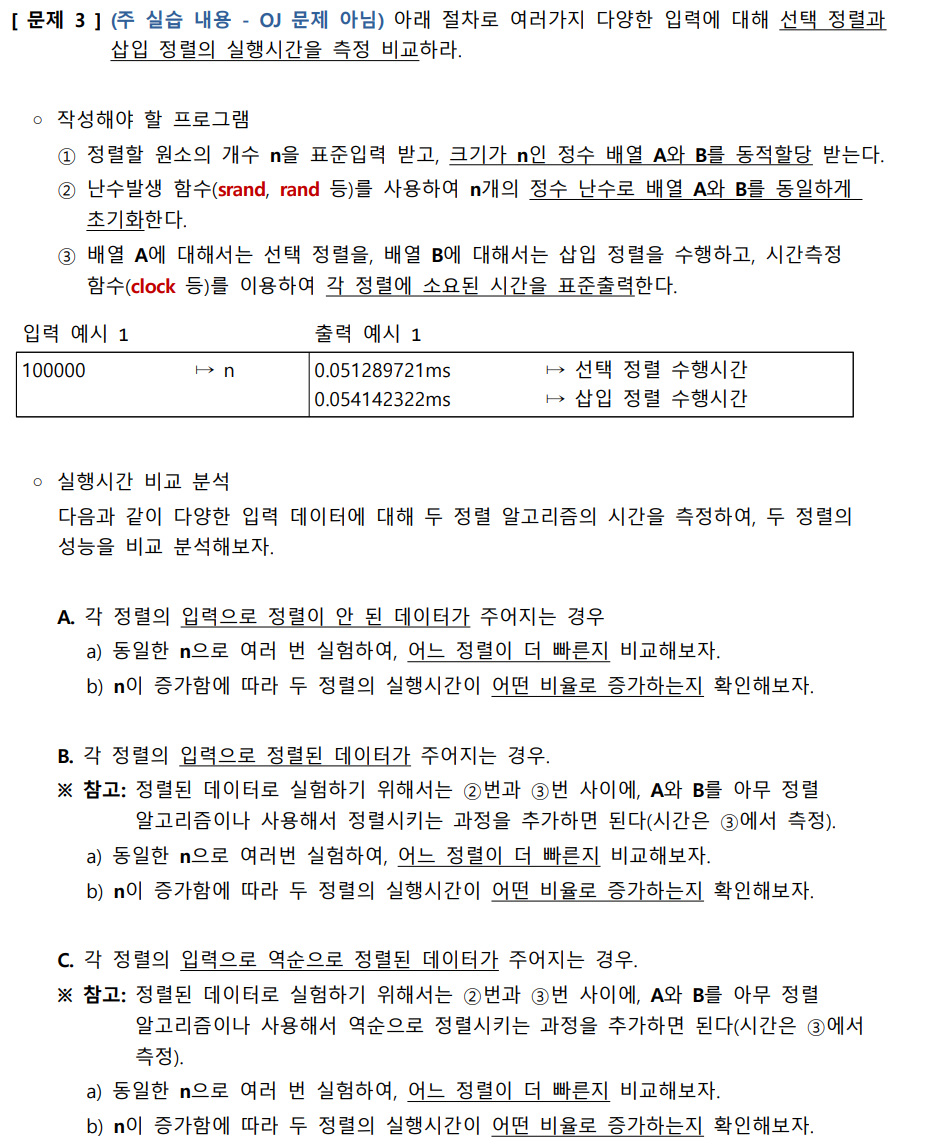 - 정렬되지 않은 데이터에 대해 선택 정렬과 삽입 정렬 중 어느 것이 더 빠른지 비교하는 것이 목표입니다.