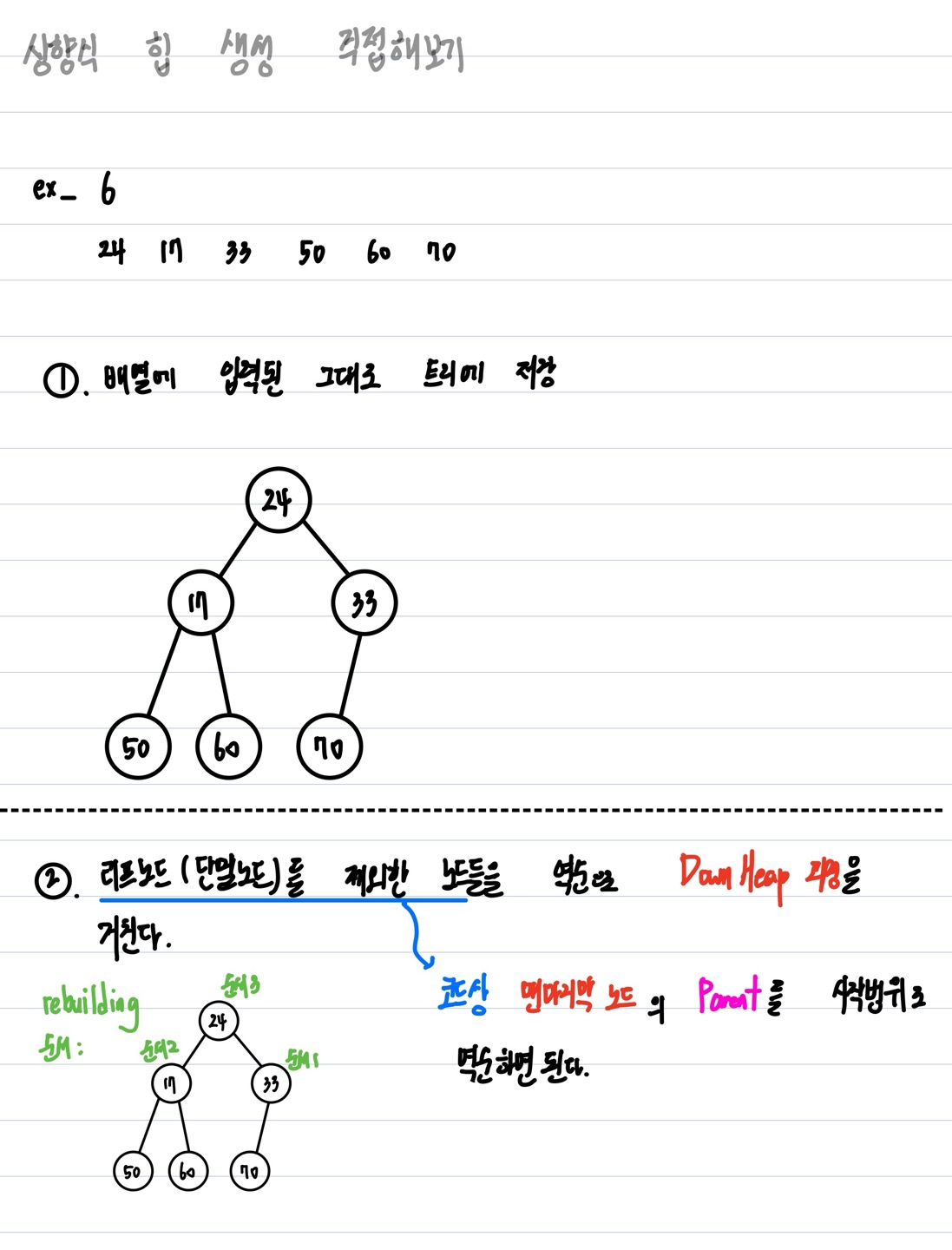 - 상향식 힙 생성는 O(n) 시간 복잡도로 더 빠르게 힙을 생성할 수 있습니다.