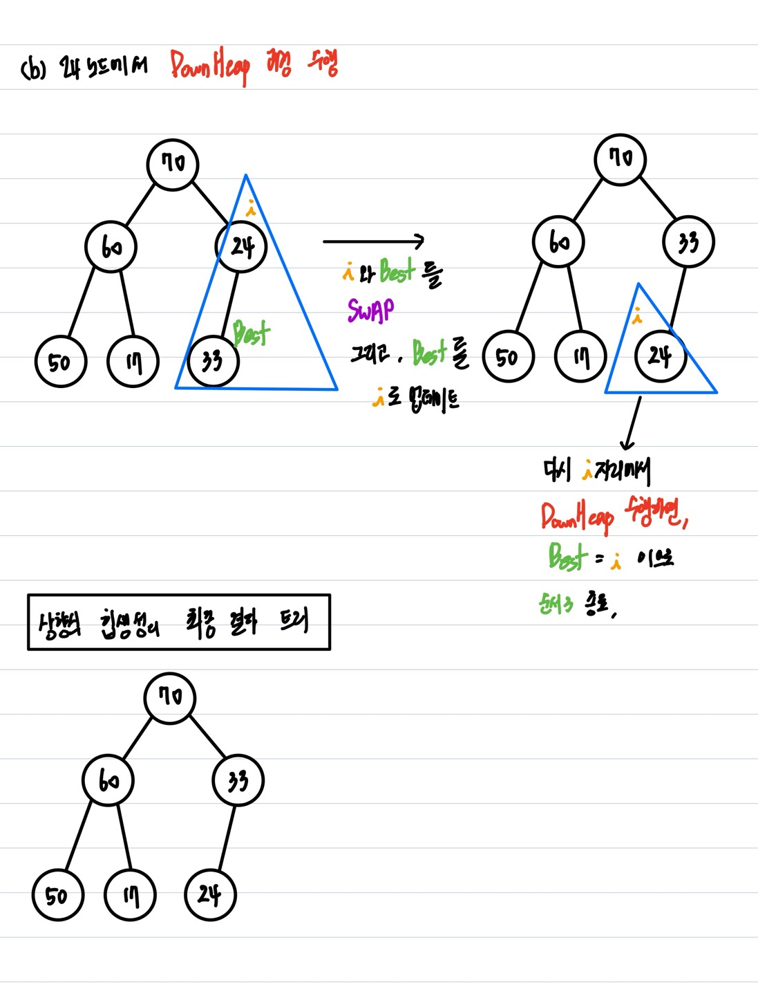우선 키들을 순차적으로 배열에 저장한 뒤, 맨 뒤의 인덱스의 부모노드부터 역순으로 루트노드까지 DownHeap()과정을 거치는 메소드이다.